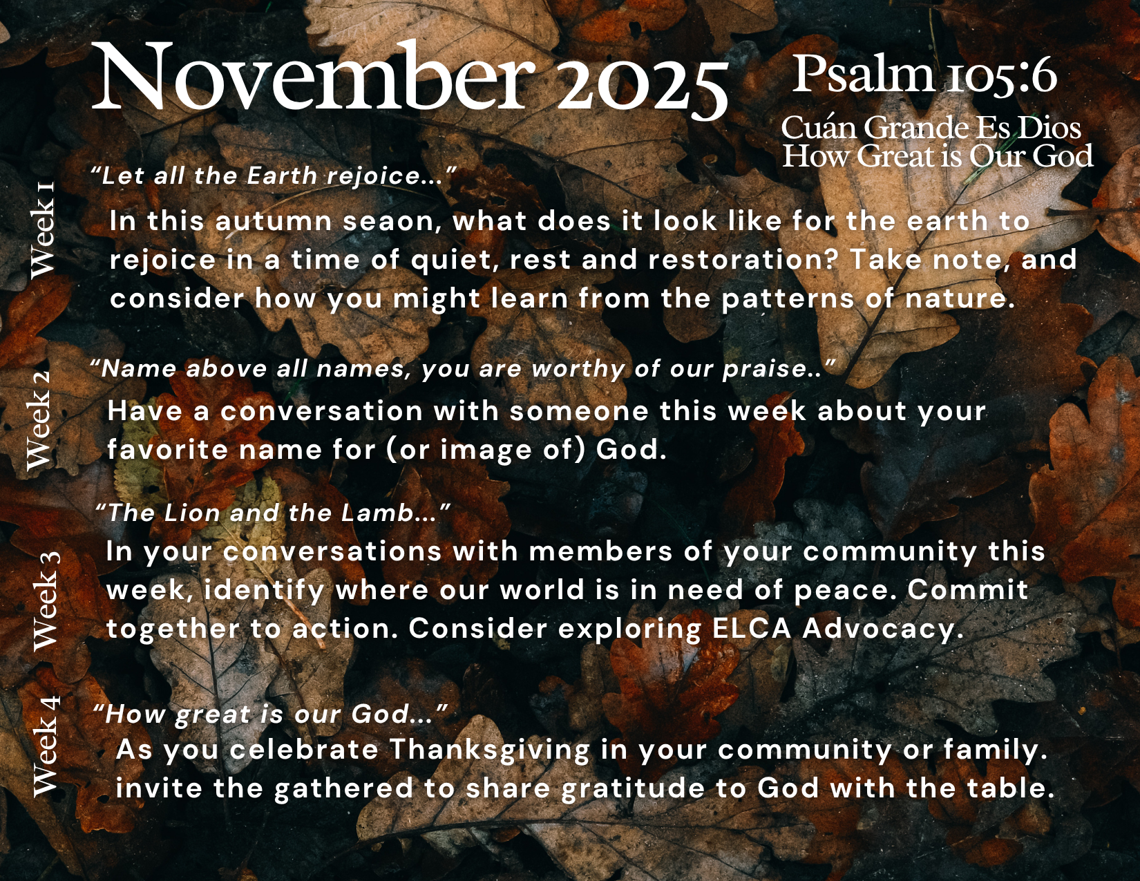 - Explore weekly practices connected to the lyrics throughout your week.